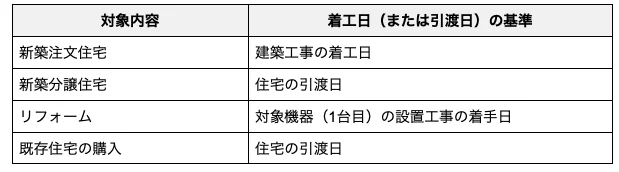 制度の対象になるには、あらかじめ定められた日以降に、工事や購入の手続きを始める必要があります。