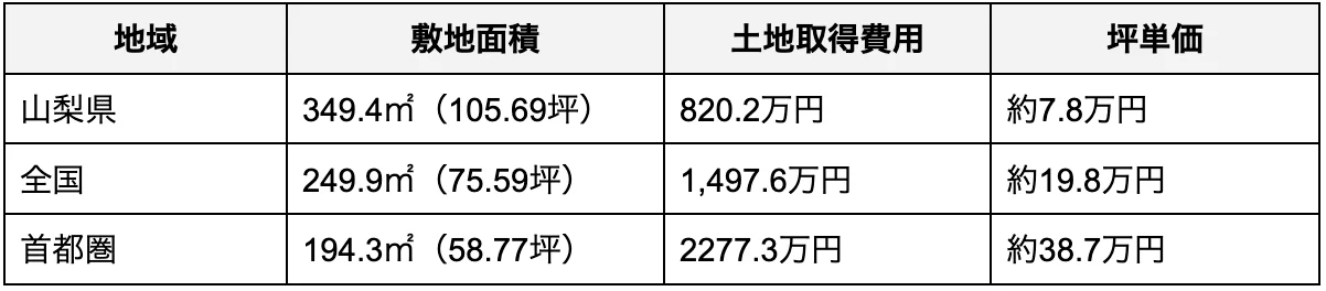 山梨県の坪単価は約7.8万円。全国平均の約19.8万円や首都圏平均の約38.7万円に比べて、12万〜30万円以上割安です。さらに、敷地面積は349.4㎡(105.69坪)と、首都圏の平均よりも46坪以上の広さです。このことから、山梨県では広い土地を安く取得できることがわかります。