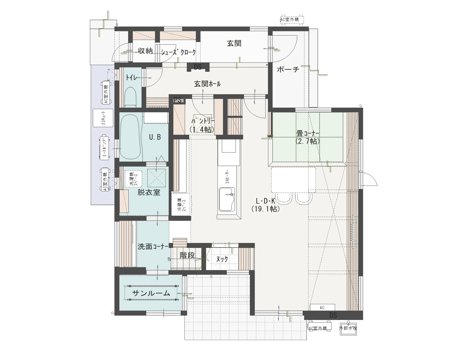 こちらの施工事例では、共働きのご家庭が日々を快適に過ごせるよう、暮らしやすさにこだわった間取りを採用しています。