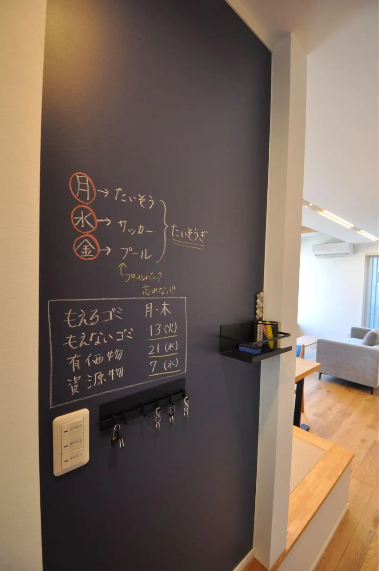 家族みんなの予定や伝言を共有できる黒板スペースを設置することで、家庭内のコミュニケーションも自然と深まります。日常の動線とコミュニケーションに配慮した、共働き世帯にぴったりの住まいです。