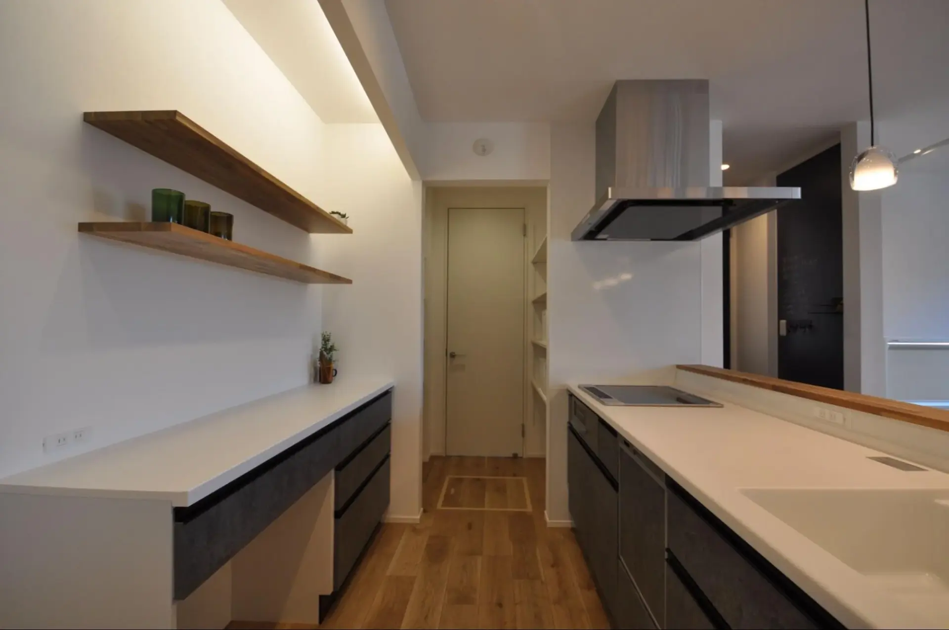 共働きの家庭にとって、家事のしやすさと毎日の動きやすさは大切です。この施工事例では、キッチンを中心とした回遊動線を採用し、家事が短い時間で済むように工夫されています。