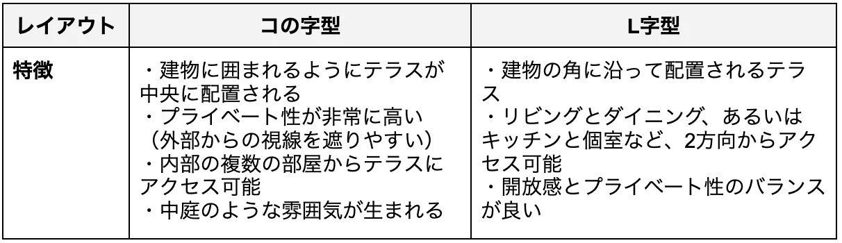 テラス付き平屋では、「コの字型」や「L字型」のレイアウトが選ばれることがあります。それぞれには、次のような特徴があります。