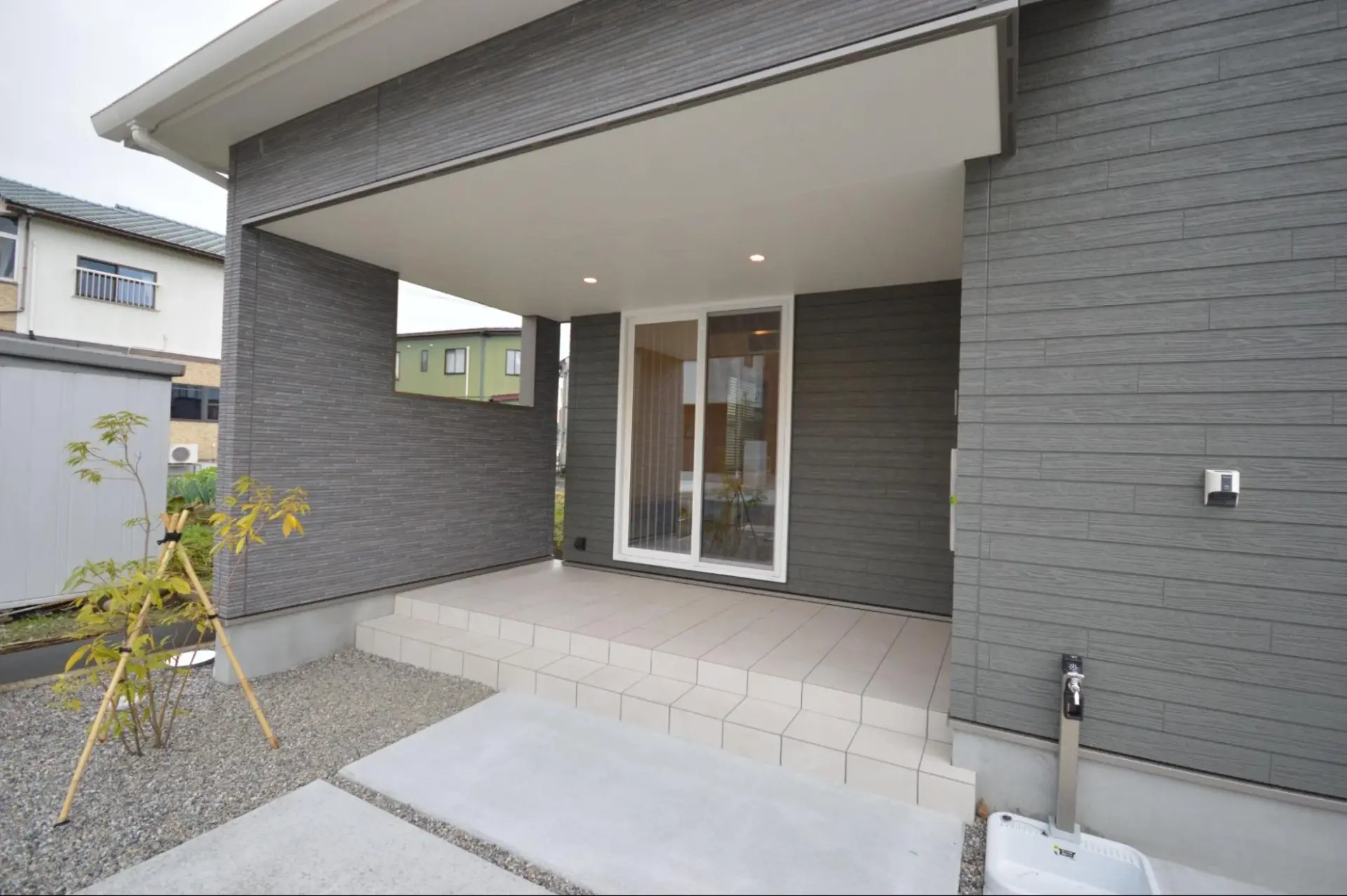 雨の日でも濡れずに出入りでき、使いやすさ抜群です。玄関前にゆとりをもたせることで、荷物の受け取りや来客対応もスムーズにできます。