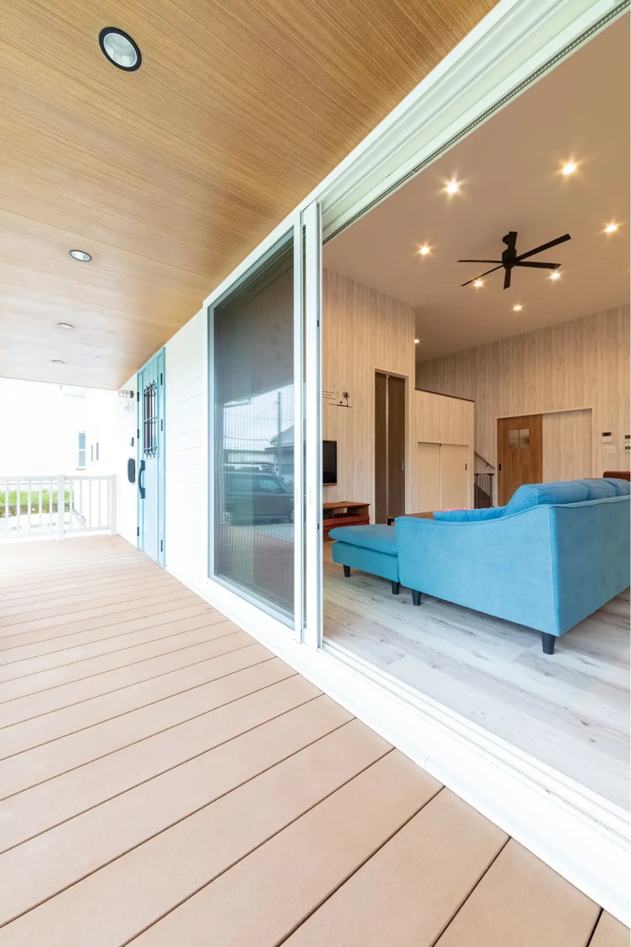 窓を開けるとリビングとカバードポーチが繋がる間取りとなっており、自然と一体感が感じられます。