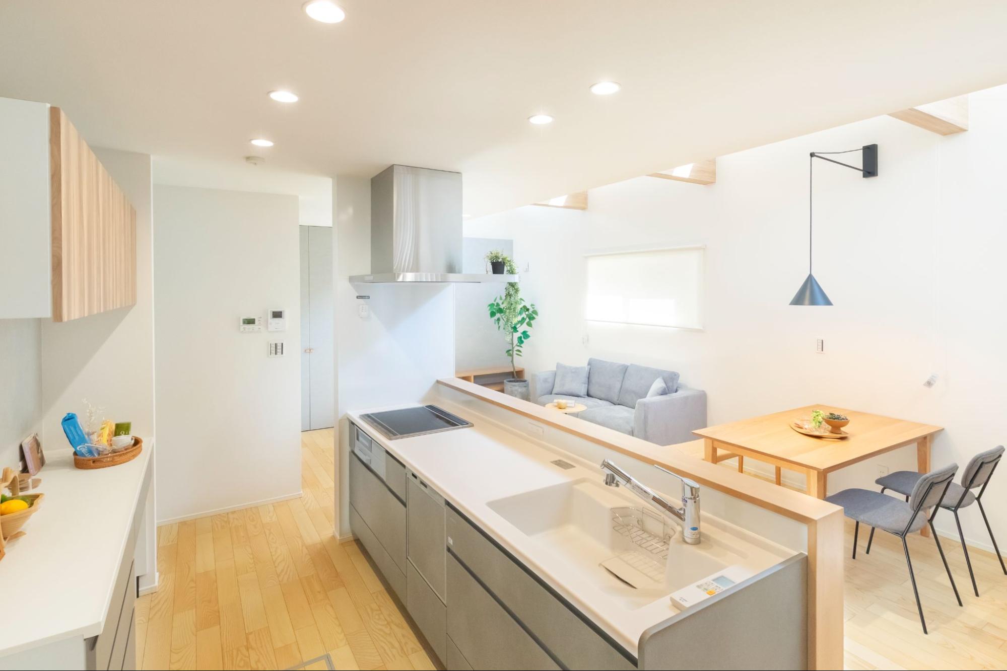 キッチンは間取りの中心にあり、左右どちらからも出入りできるレイアウト。人が集まっても動きやすく、ストレスのない快適さが魅力です。