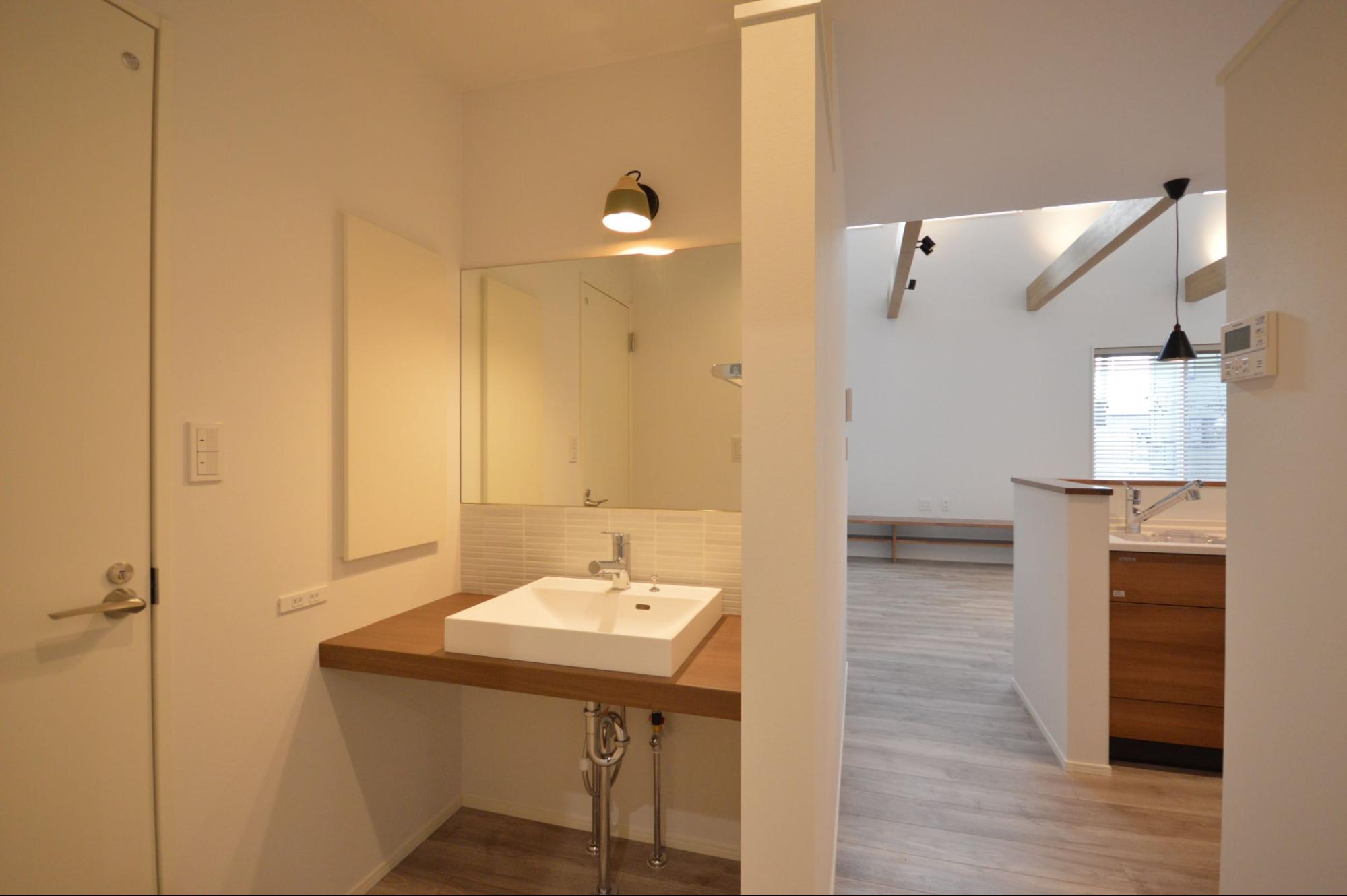 洗面スペースはLDKと繋がりながらも死角に配置され、快適な空調の中で身支度ができます。暮らしやすさとデザイン性が見事に融合した、心地良い平屋です。