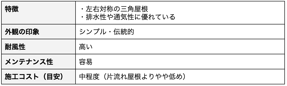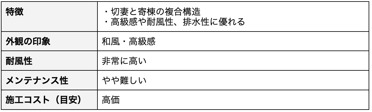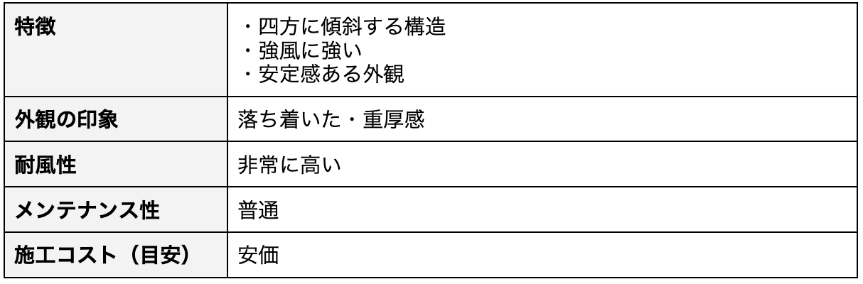 寄棟屋根は、四方向に傾斜面を持つ構造で、全体的に落ち着いた印象があります。風を受けにくく、耐風性に優れていることが特徴です。