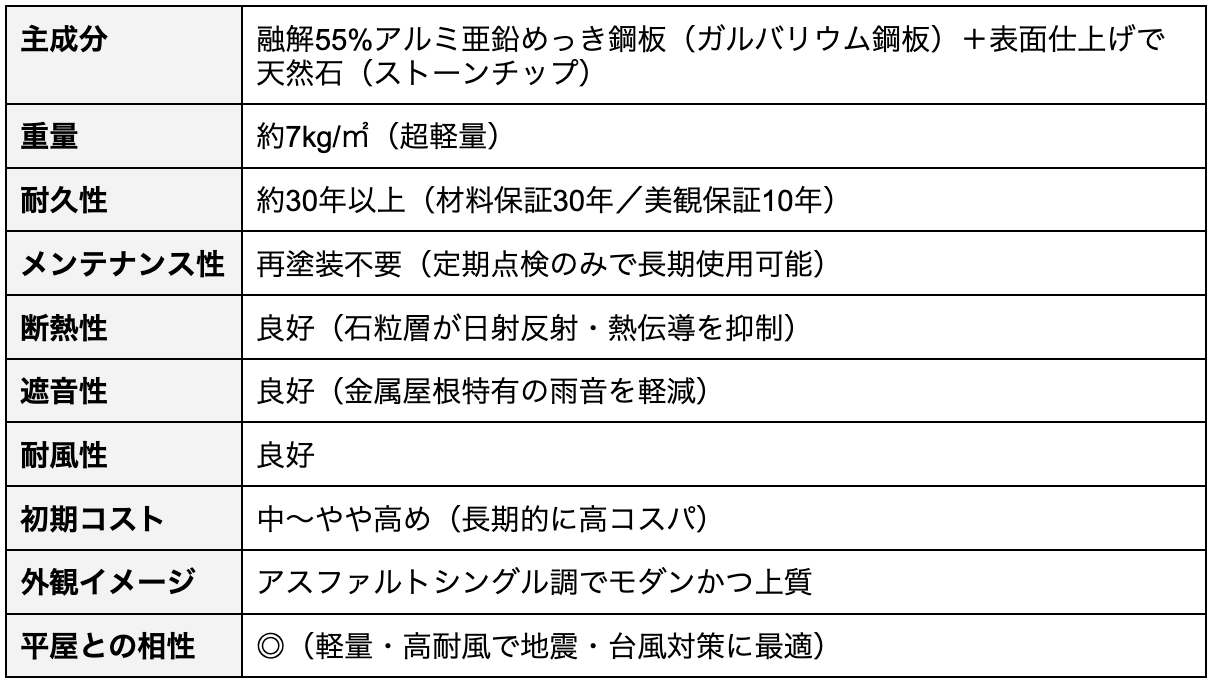 一見すると高価に感じる自然石粒化粧鋼板ですが、塗り替えの手間がなく、長く安心して使えることを考えると、結果的にコスパの良い屋根材です。デザインもスタイリッシュで、株式会社ステーツの注文住宅にも採用されており、平屋との相性も抜群です。