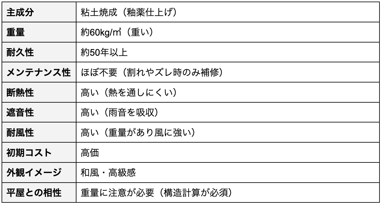 陶器瓦は、粘土を高温で焼き固めた伝統的な屋根材で、優れた耐久性と美しい質感を持ちます。塗装の必要がなく、色あせや腐食の心配がほとんどないため、長期的にメンテナンスコストを抑えられます。重さがあるため耐震設計が重要になりますが、その分遮音性・断熱性に優れ、快適な室内環境を保ちやすい素材です。
