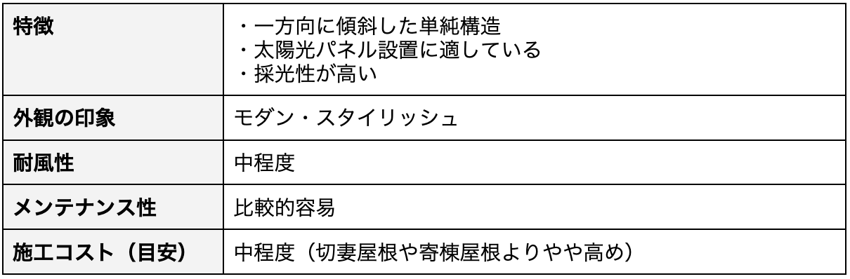 片流れ屋根は、屋根面が一方向に傾斜している形状です。構造がシンプルで施工が比較的容易なため、コストを抑えやすい利点があります。また、太陽光パネルを設置しやすく、日当たりの良い明るい住まいづくりに適しています。