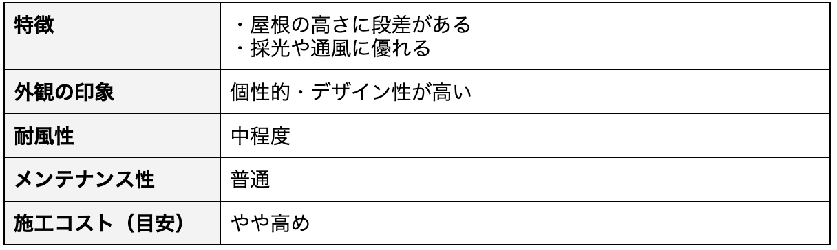差し掛け屋根は、二つの屋根面が異なる高さで交差する形状です。見た目に動きがあり、外観に個性を出せます。構造が比較的シンプルで、コストを抑えながらデザイン性を高めたい方に適しています。