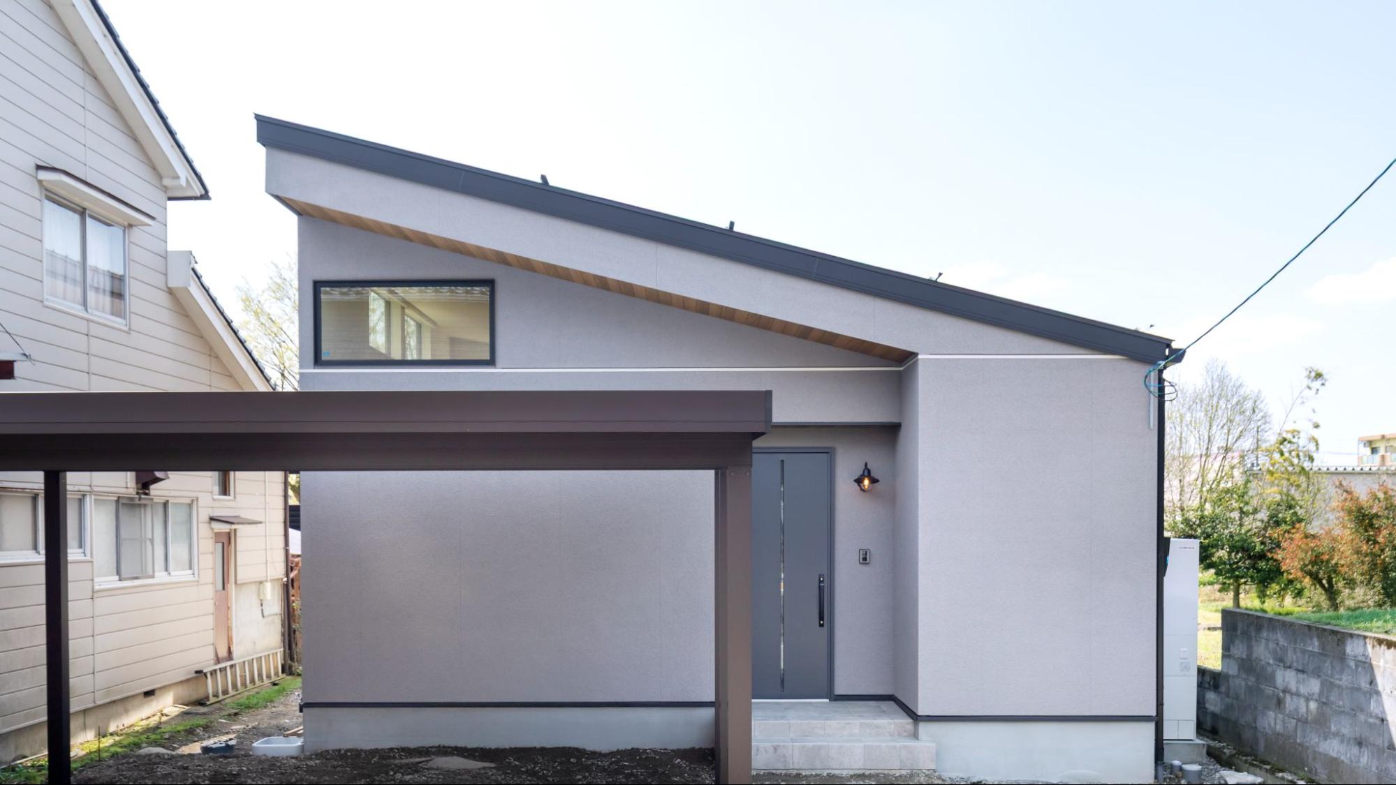 こちらの平屋は、ステーツが手掛けた片流れ屋根の住まいです。屋根を一方向に流すことで、外観にすっきりとしたラインが生まれ、シンプルながらも洗練された印象に仕上がっています。落ち着いたグレーの外壁と組み合わせることで、街並みに自然に溶け込みながらも存在感のあるモダンデザインを実現しました。