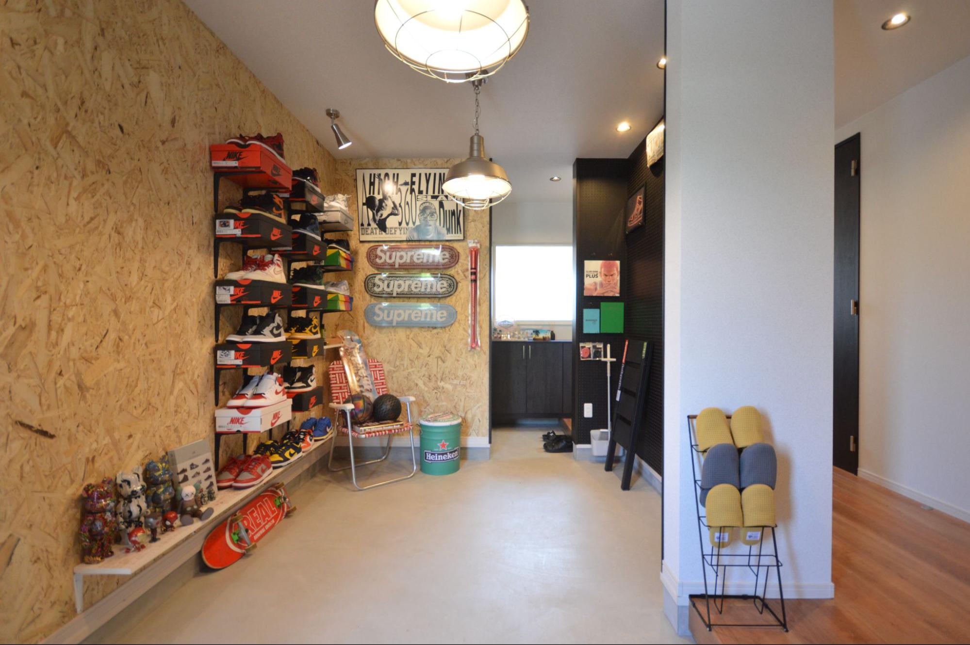 埼玉県のこちらの平屋は、趣味と快適な暮らしを両立した理想の住まいです。玄関は広々としており、趣味のアイテムを飾ったり、ちょっとした作業を楽しんだりできる空間になっています。
