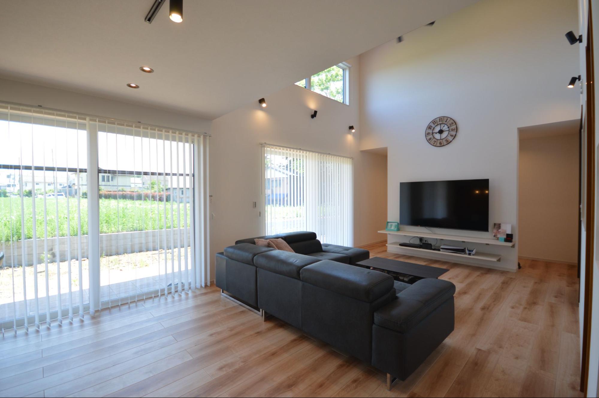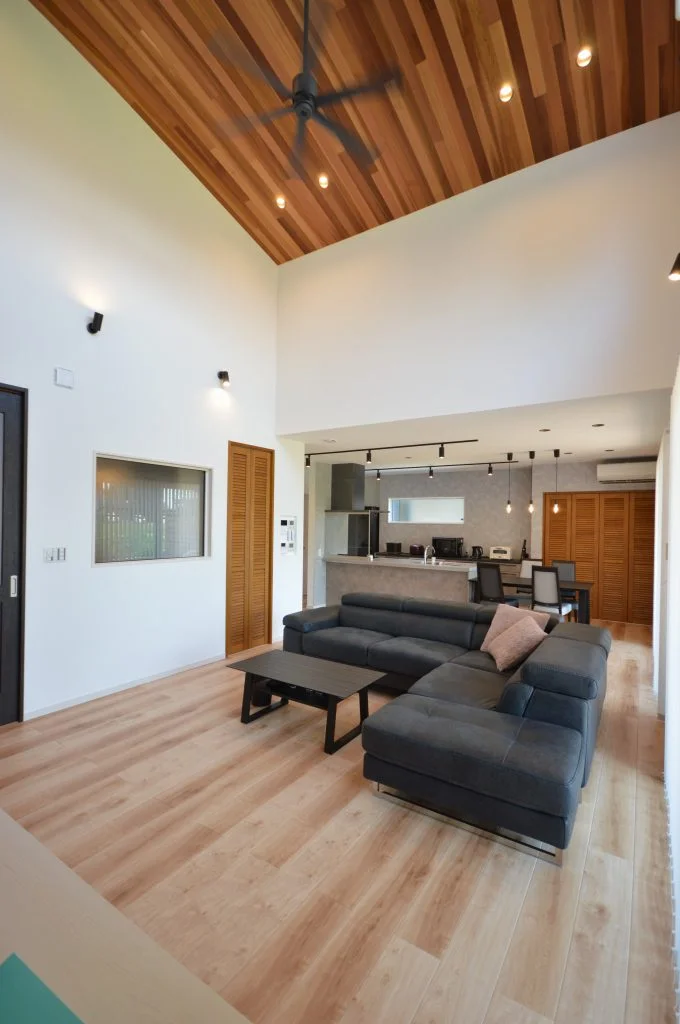 リビングは勾配天井と大開口の窓が特徴で、自然光がたっぷりと入り、開放感に包まれた空間です。ワンフロアで生活が完結するため、移動もスムーズで家事もラク。裏庭には家族やペットと過ごせるドッグラン付きのスペースがあります。