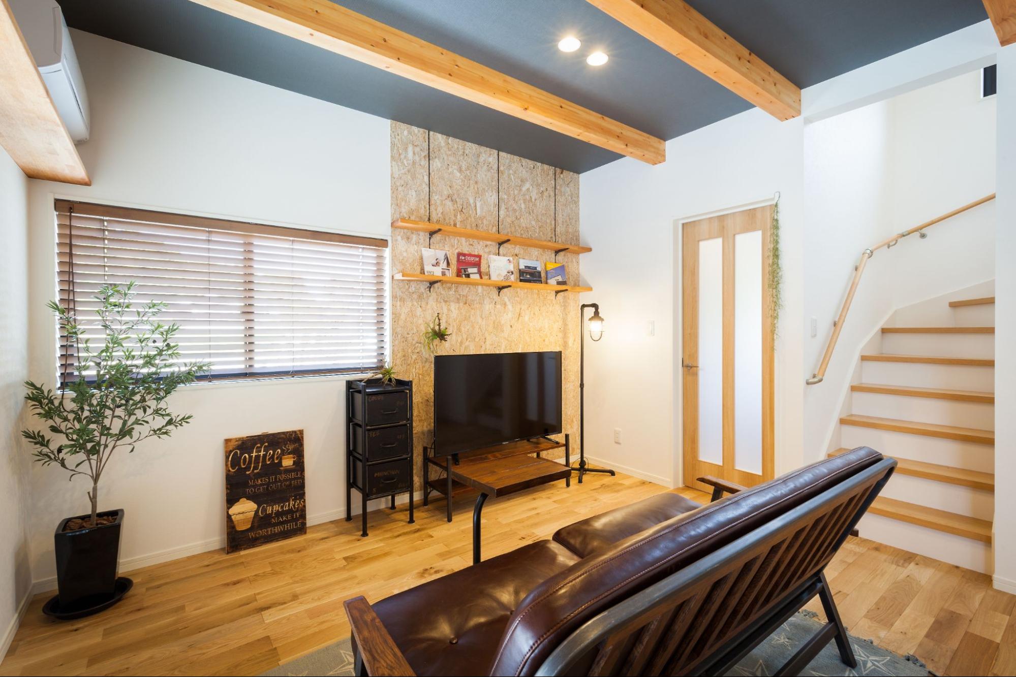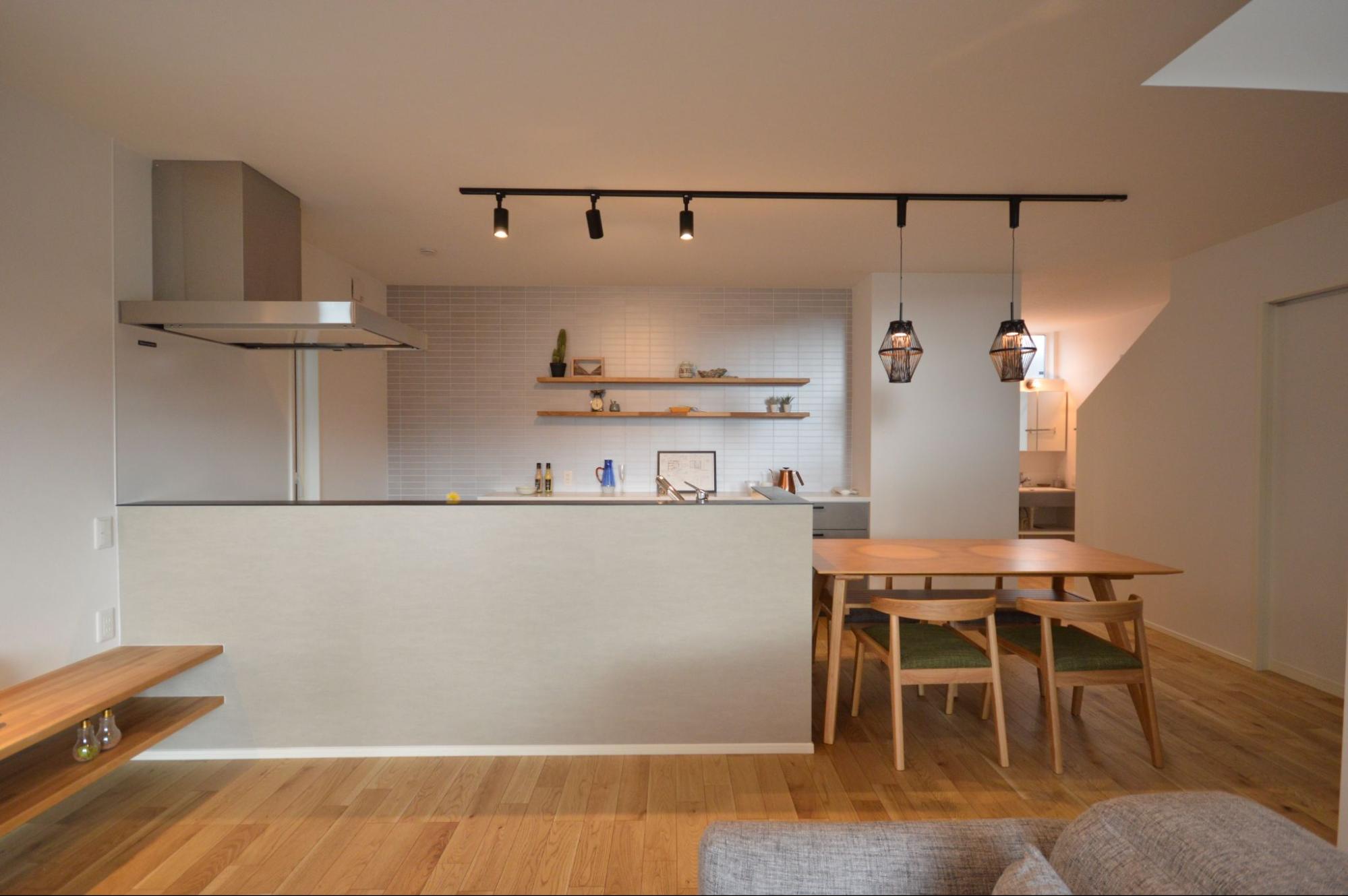 1階は壁付けキッチンでダイニングを広く確保し、天井や床材の切り替えでリビングとのつながりにメリハリを演出。階段と一体にしたリビングは抜け感があり、開放的に感じられます。