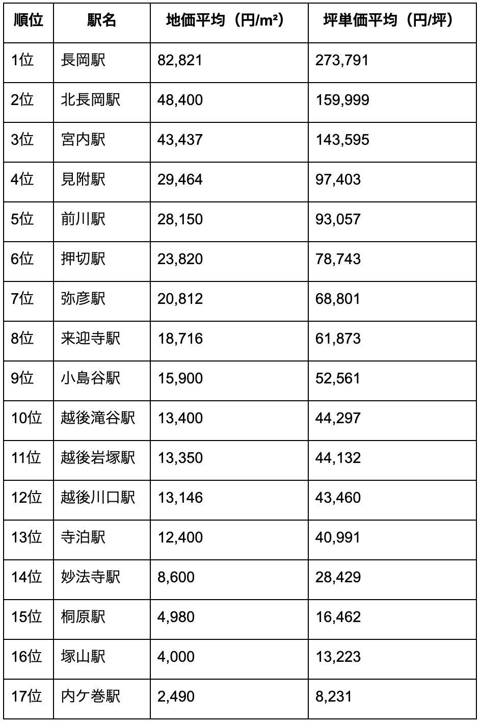 長岡市内および周辺の鉄道駅の地価を、地価平均・坪単価平均の順にまとめたものが下表です。(長岡市に存在しない近隣の駅も含めています。)