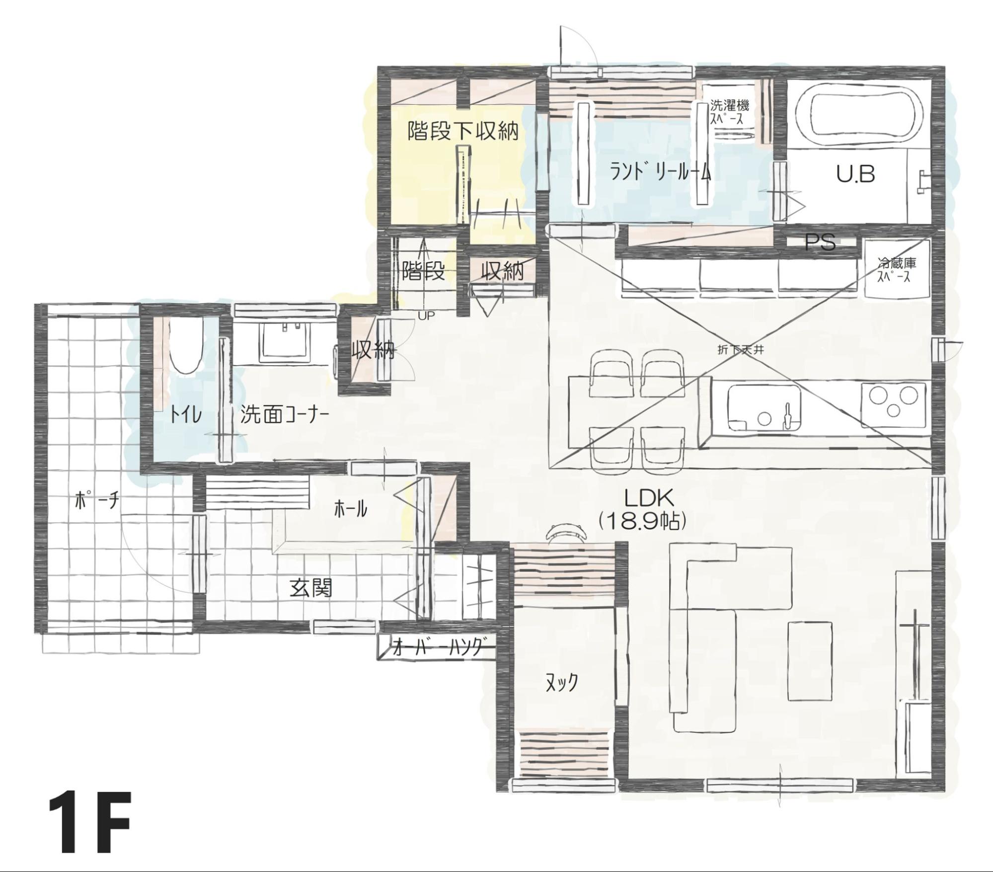 玄関から入ると、18.9帖の開放的なLDKがあります。キッチンからは、リビングを見渡すことができ、ヌックが用意されているのも特徴的な間取りです。