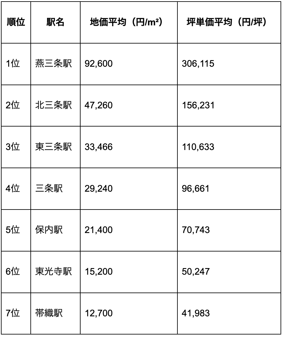 三条市および周辺の主要駅を対象に、地価平均・坪単価平均順にまとめたものが下表です。