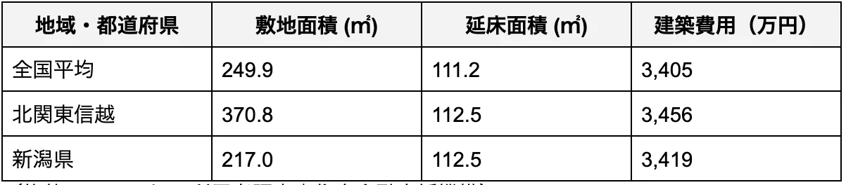 土地を既に所有している場合や親族から提供されるケースでは、建築費用が発生します。また、分筆や水道、下水道、所有権移転、地盤改良、造成工事などの費用が別途必要です。以下は、全国と新潟県、北関東信越エリアでの相場の比較です。