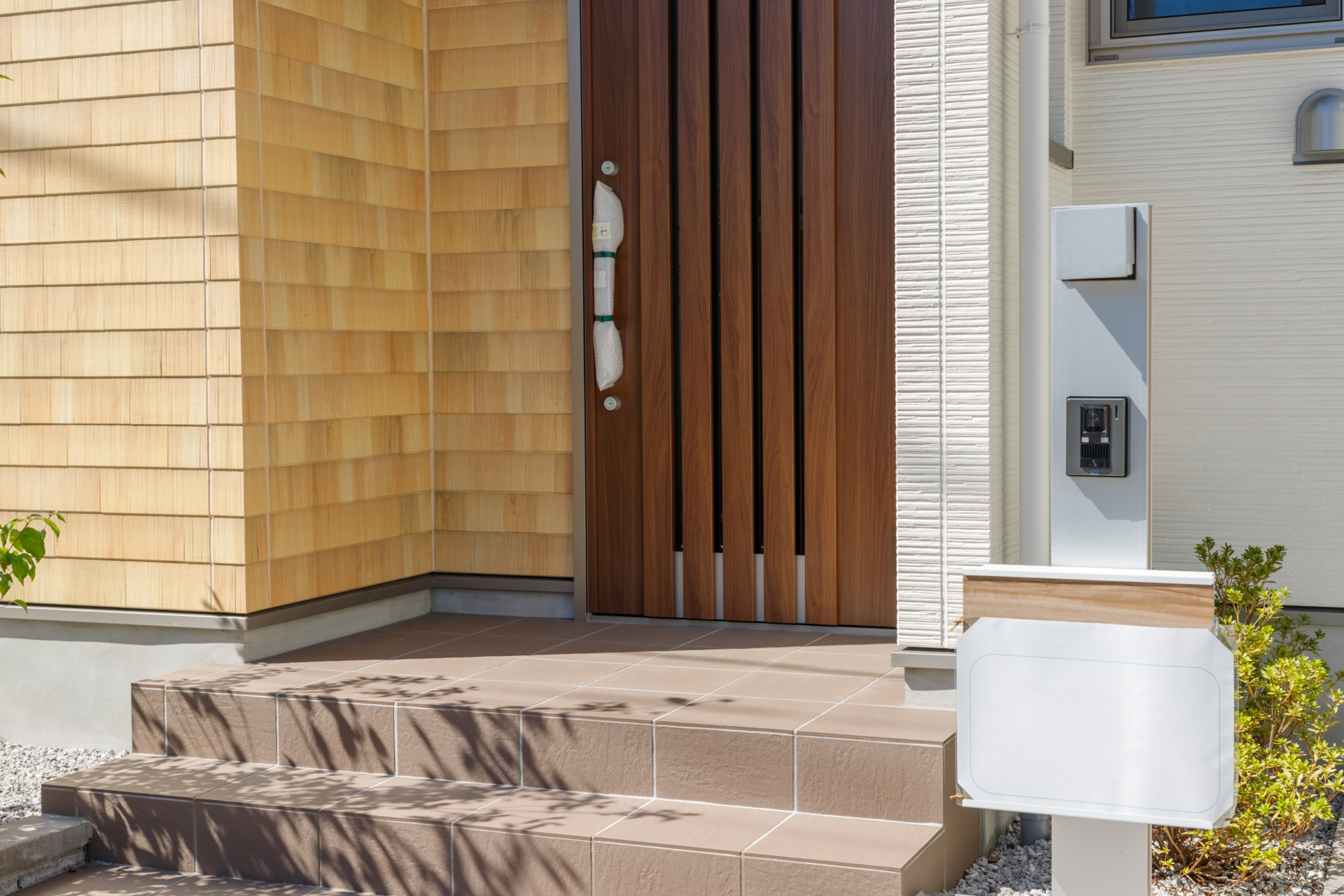 - 明るいトーンの石材や舗装材の色を使って、玄関周りの印象を軽やかにする