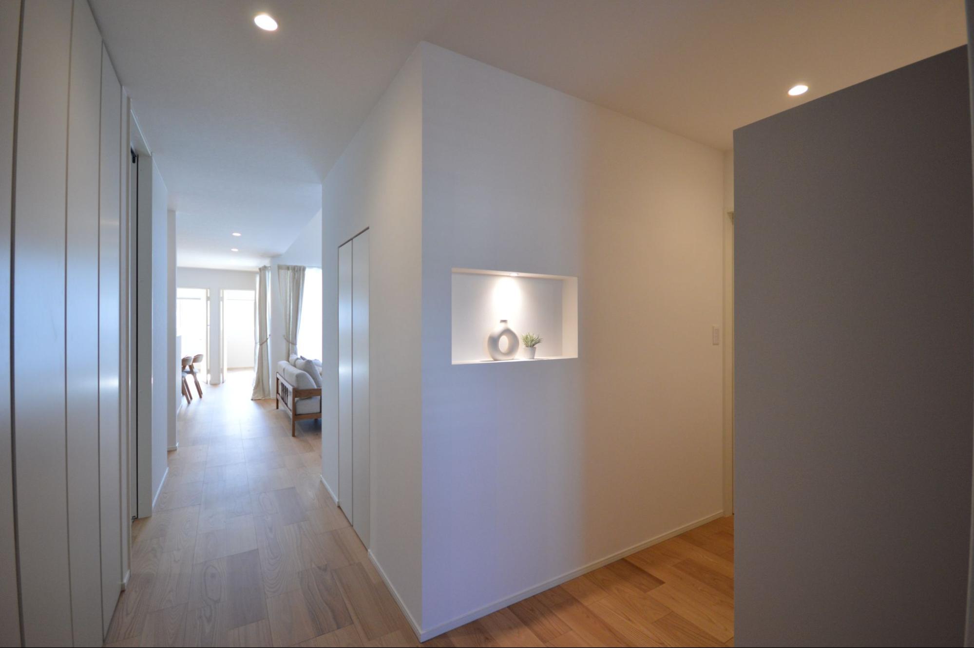 玄関からLDKまでは一直線で繋がっており、来客時も個室側を通さずに案内できて安心。南面のLDKは大きな窓と高い天井が生み出す解放感が心地良く、家族が自然と集まる住まいです。