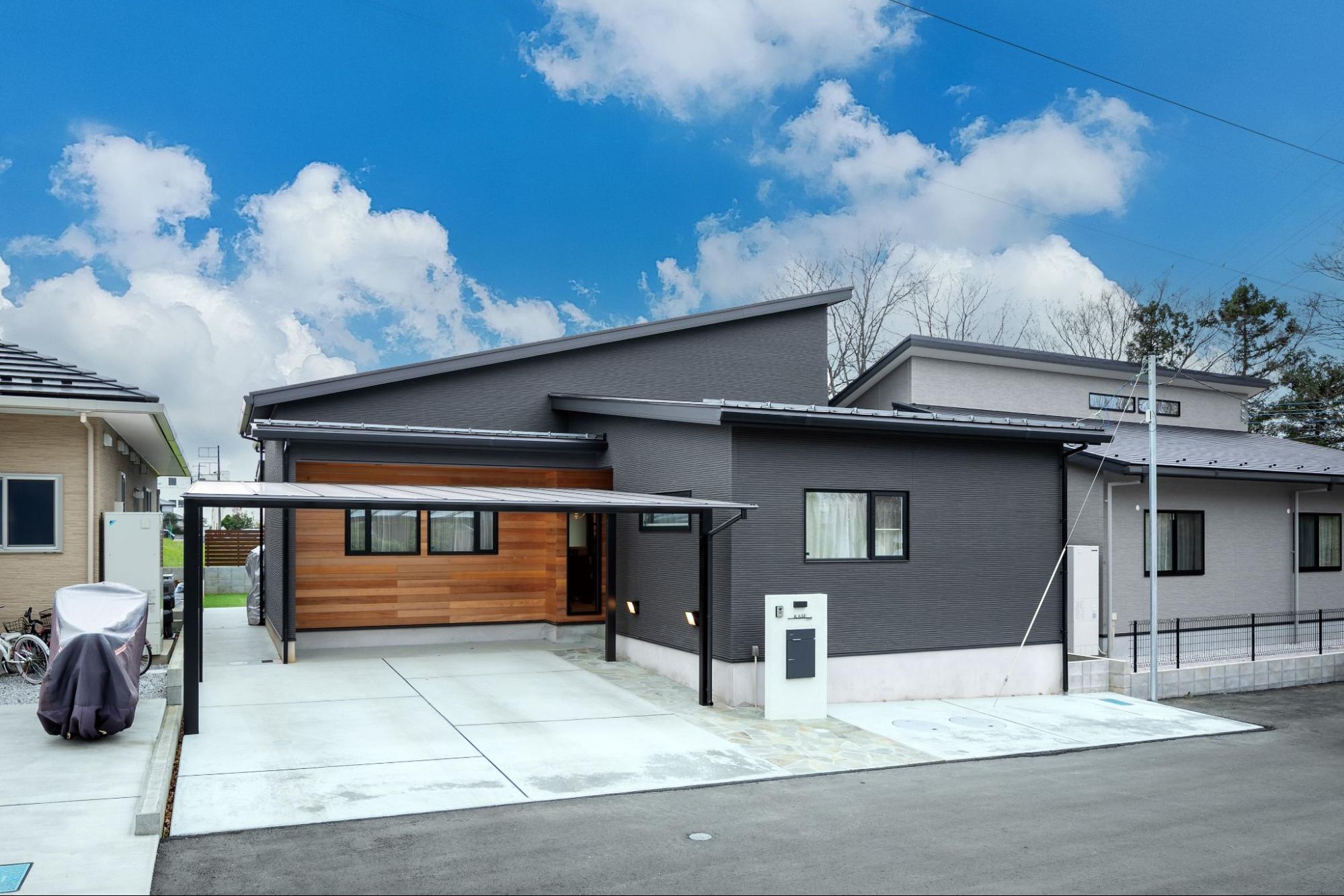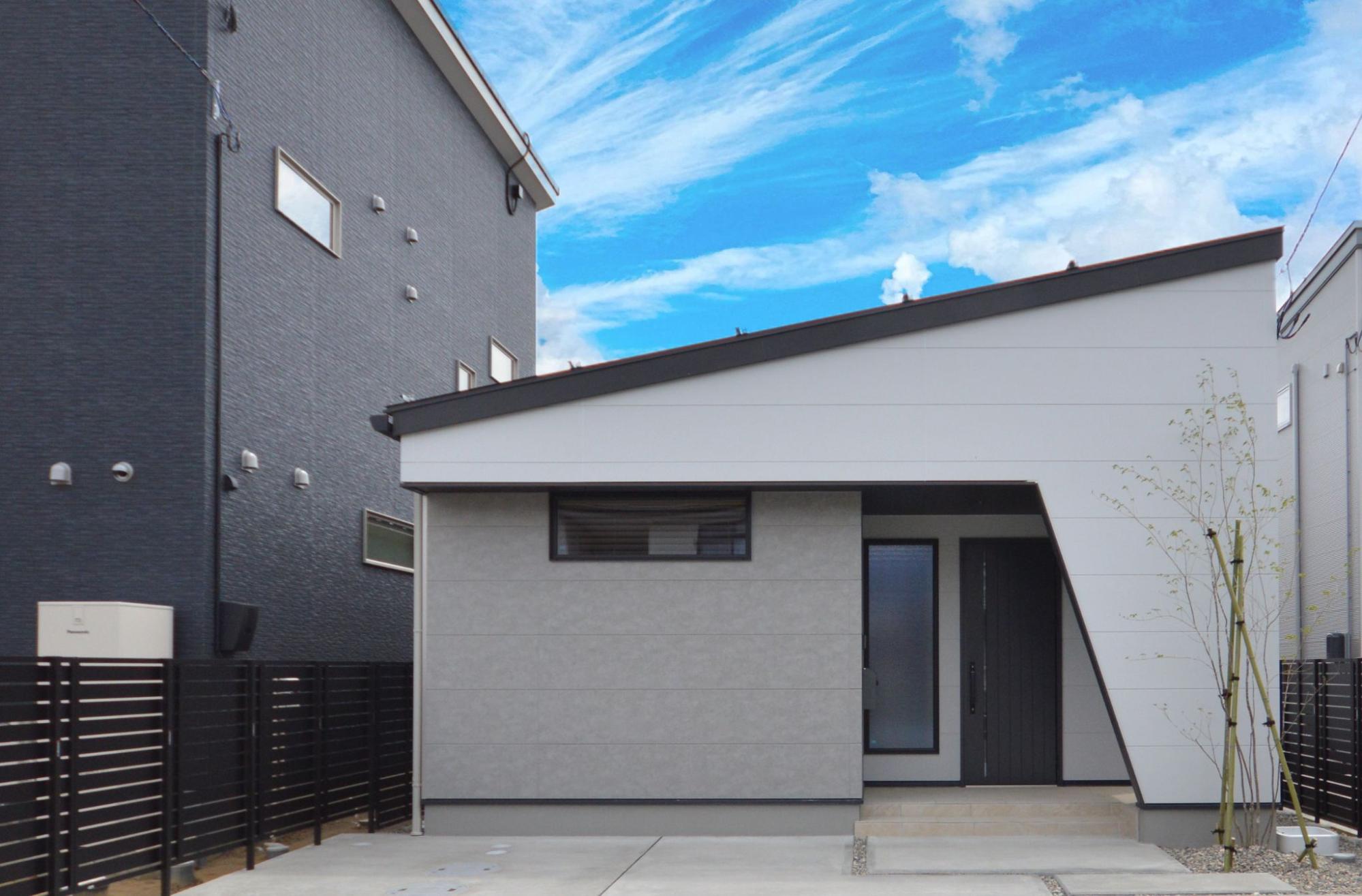 北側に玄関を置きつつも、南側には明るいLDKを設けた平屋です。玄関周りはすっきりとした外観で、ドア横のFIX窓がほど良く光を取り込みます。人目が気になりにくい配置で、ゆったり落ち着いた雰囲気が魅力です。