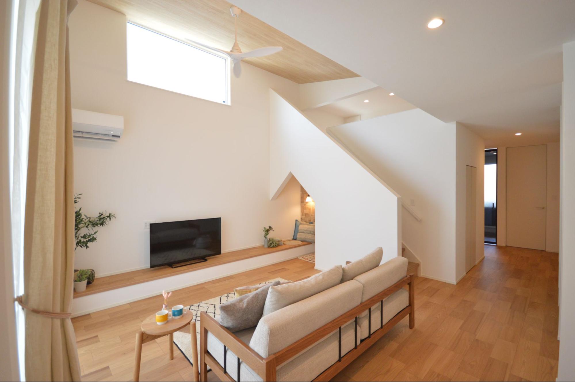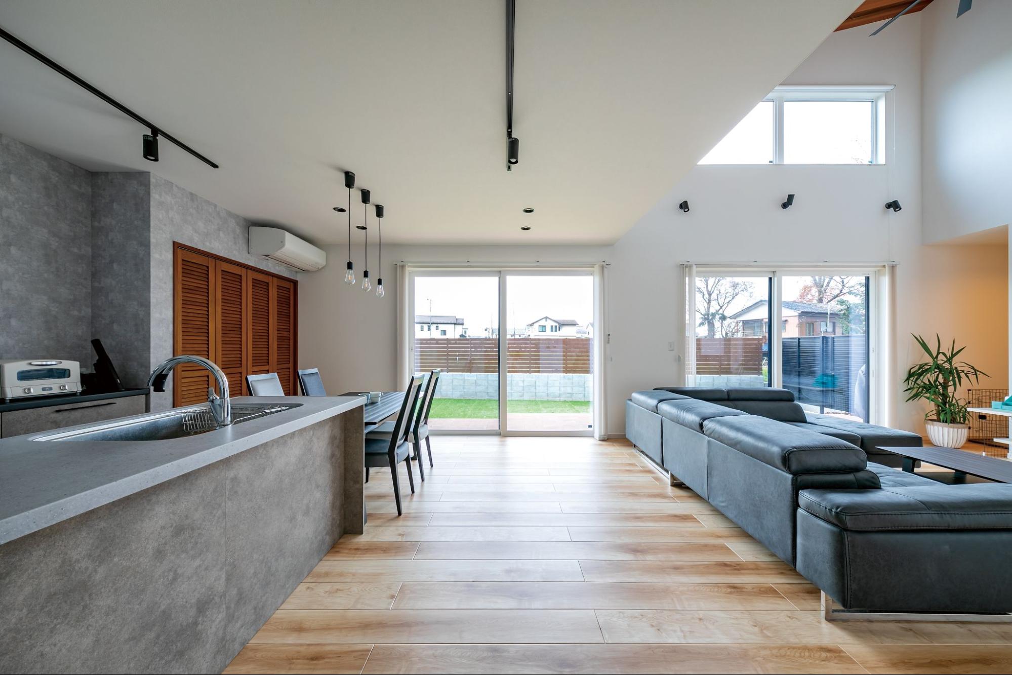 南面には落ち着いたLDKを配置し、大きな窓と勾配天井の気持ち良さが相まって、家全体が広々と開放的な雰囲気に。