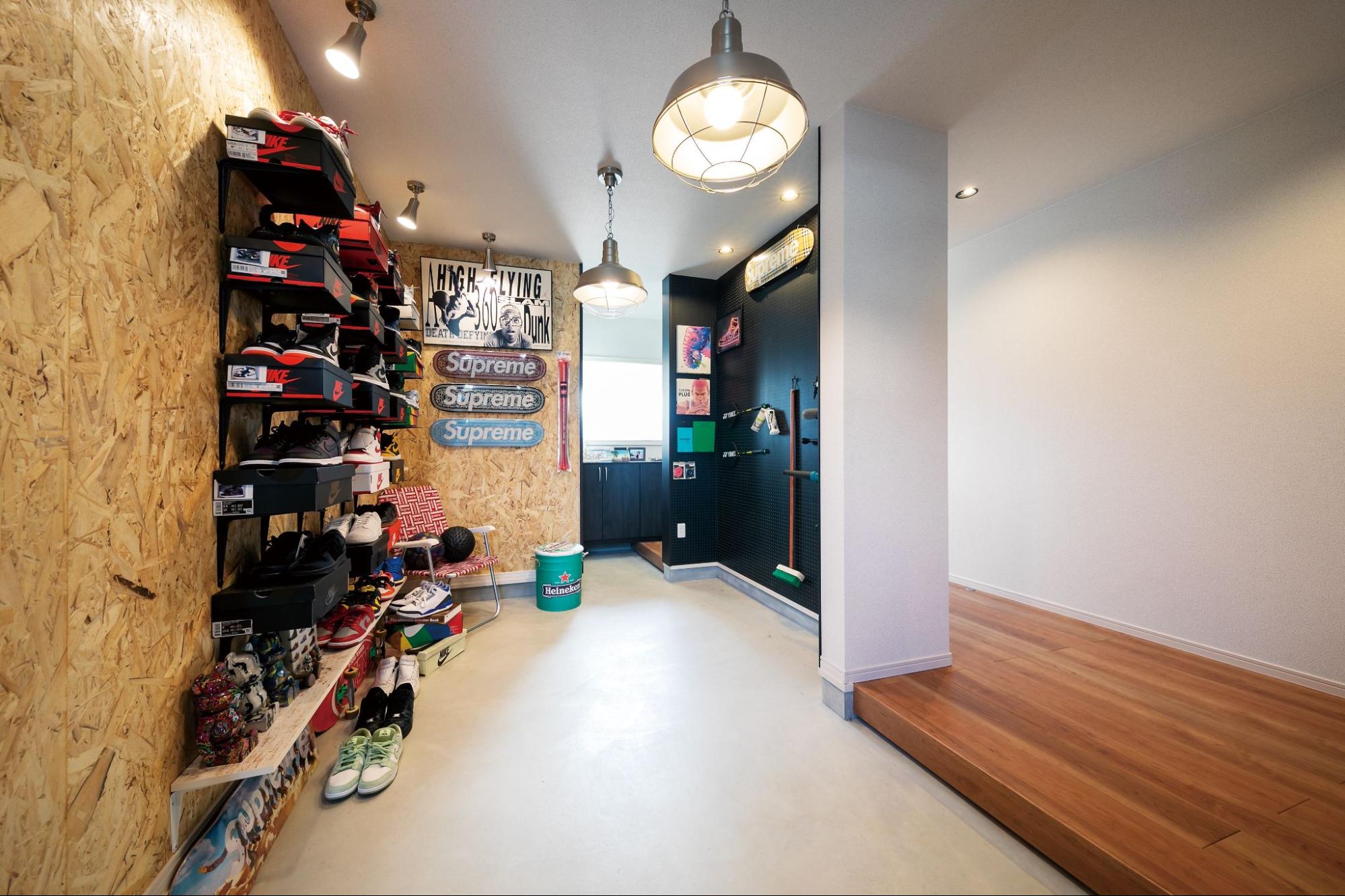 こちらは北玄関に土間スペースを十分に確保した平屋です。アウトドア用品を置いたり、お気に入りの雑貨を飾ったりと、「見せる楽しさ」と収納力を両立したつくりになっています。