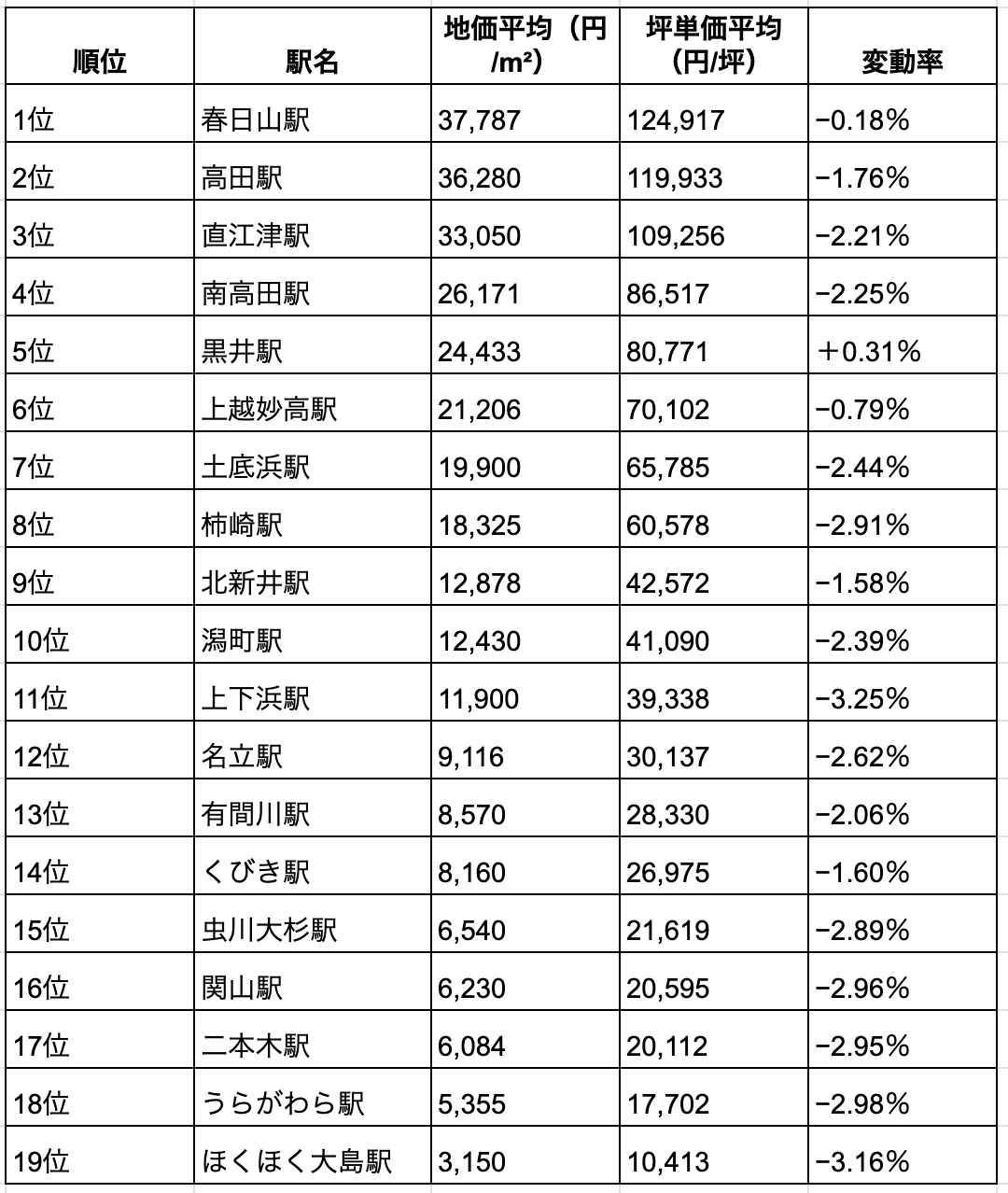 上越市内の主要駅について、地価平均・坪単価平均・変動率をまとめると以下のとおりです。