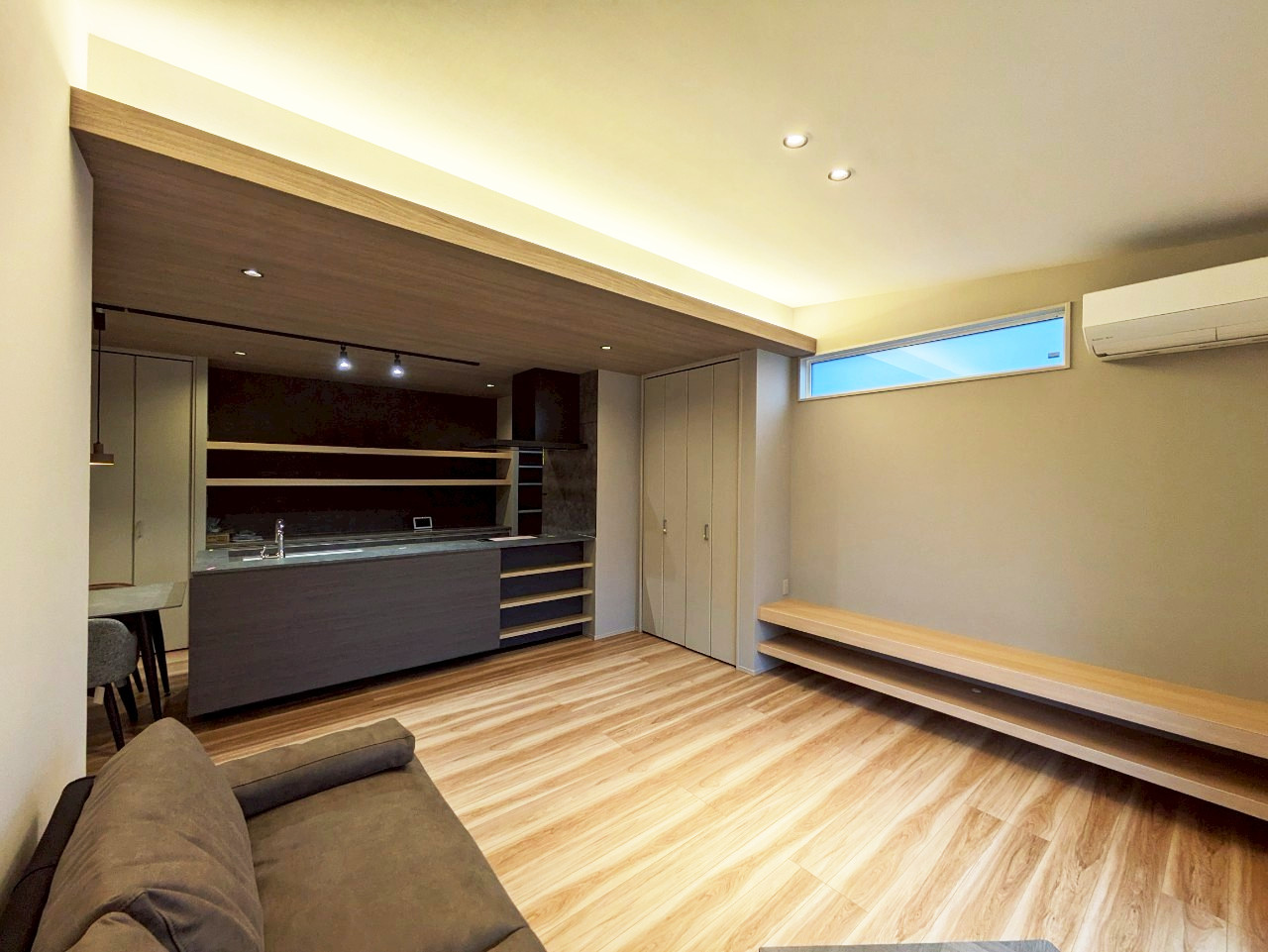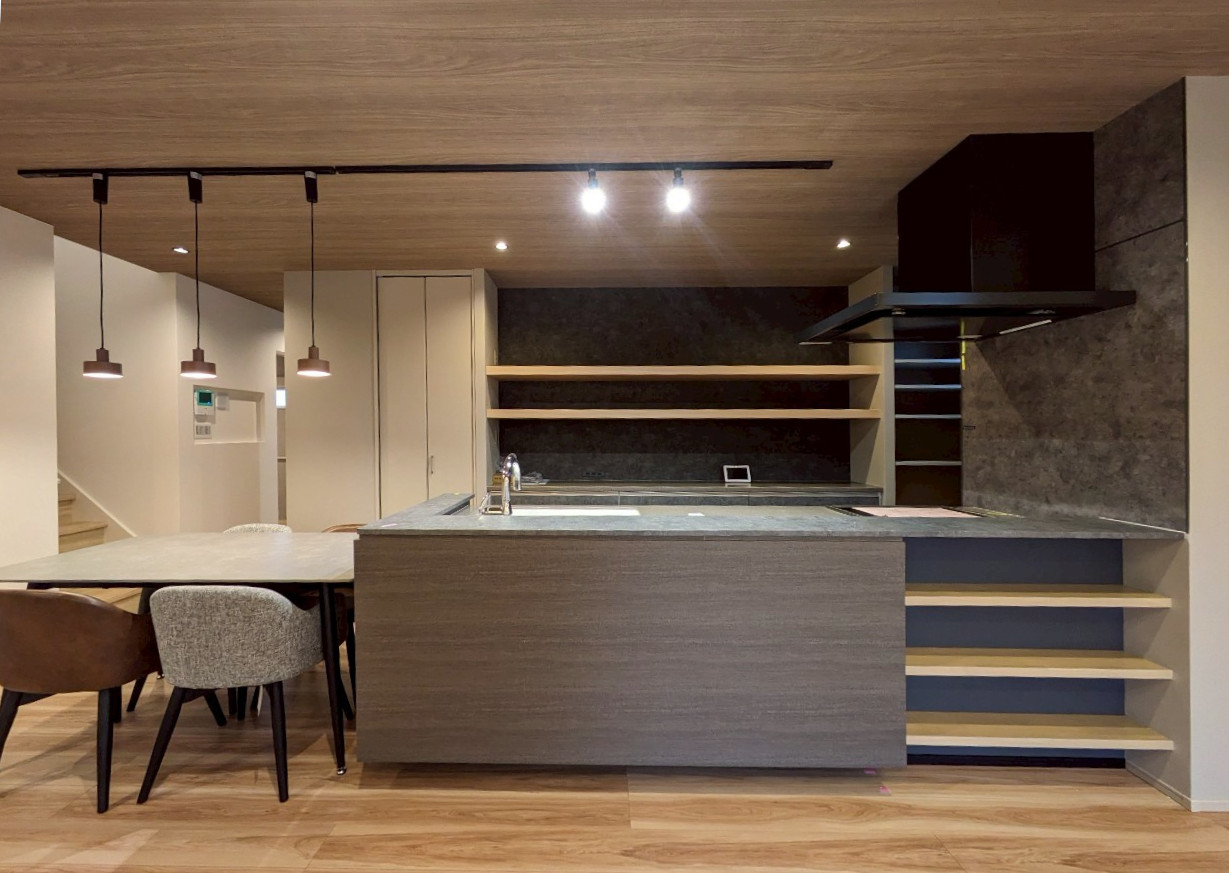 別角度から見たときのLDKの内観です。カウンターキッチンは上品な黒基調で、ライティングレールが採用されています。