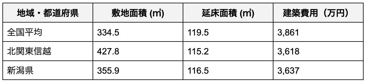 土地を既に所有している場合や親族から提供されるケースでは、建築費用が発生します。また、分筆や水道、下水道、所有権移転、地盤改良、造成工事などの費用が別途必要です。以下は、全国と新潟県、北関東信越エリアでの相場の比較です。