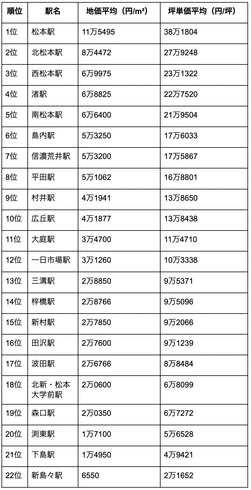 松本市内および周辺の鉄道駅の地価を、地価平均・坪単価平均の順にまとめたものが下表です。(松本市に存在しない近隣の駅も含めています。)