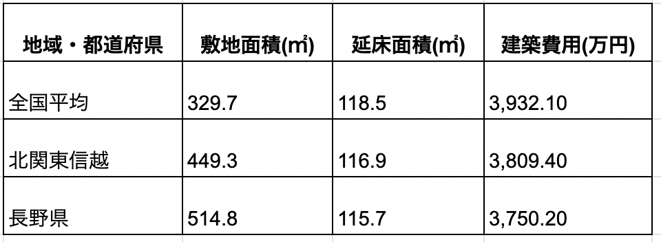 土地を既に所有している場合や親族から提供されるケースでは、建築費用が発生します。また、分筆や水道、下水道、所有権移転、地盤改良、造成工事などの費用が別途必要です。以下は、全国と長野県、北関東信越エリアでの相場の比較です。