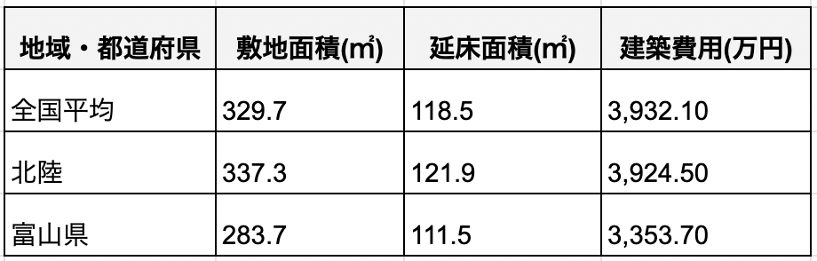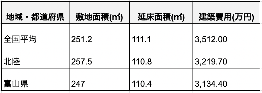 土地を既に所有している場合や親族から提供されるケースでは、建築費用が発生します。また、分筆や水道、下水道、所有権移転、地盤改良、造成工事などの費用が別途必要です。以下は、全国と富山県、北陸エリアでの相場の比較です。