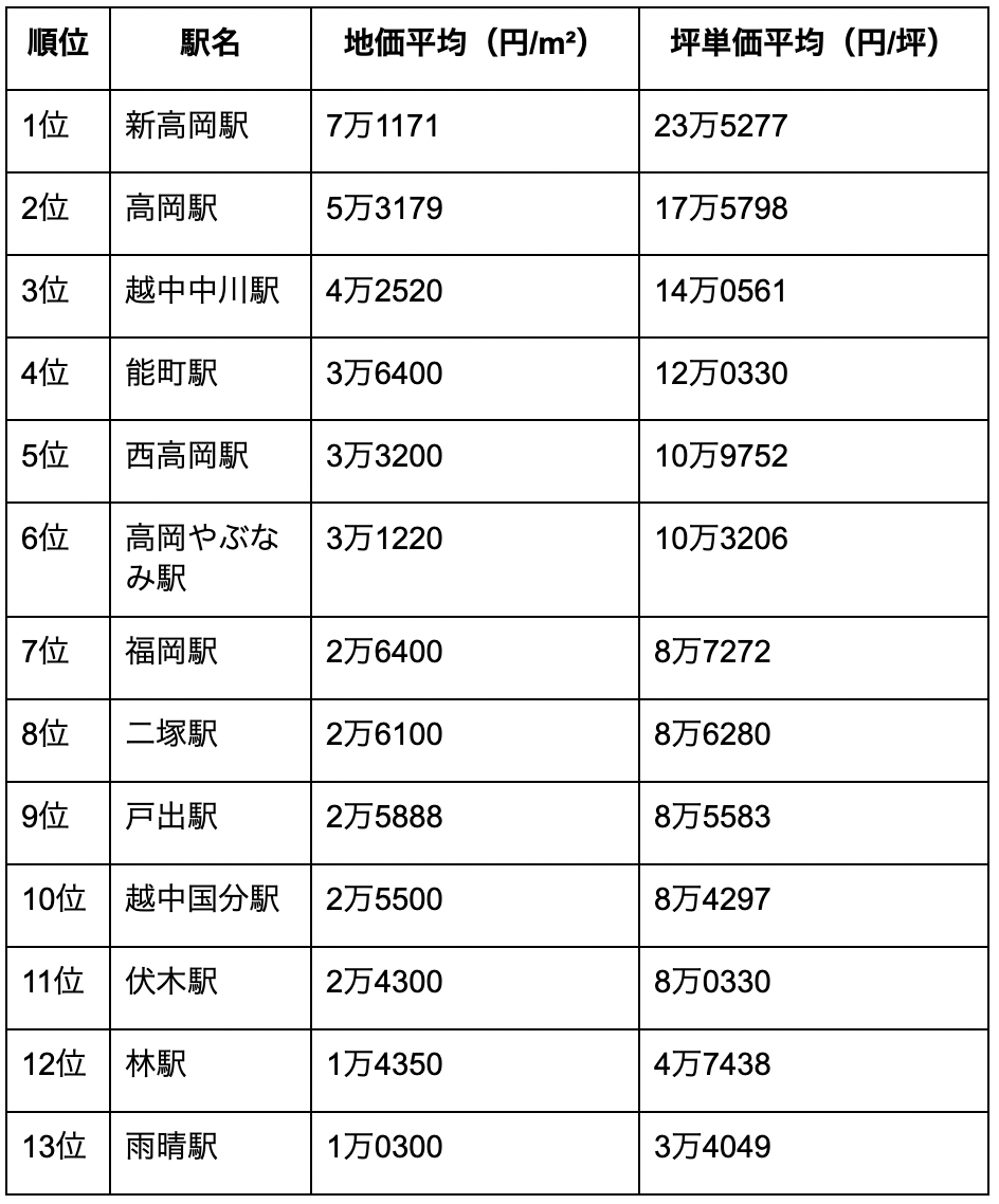 高岡市内および周辺の鉄道駅の地価を、地価平均・坪単価平均の順にまとめたものが下表です。(高岡市に存在しない近隣の駅も含めています。)