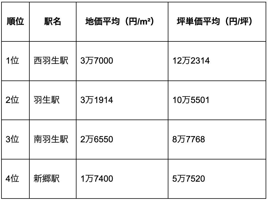 羽生市および周辺の主要駅を対象に、地価平均・坪単価平均順にまとめたものが下表です。
