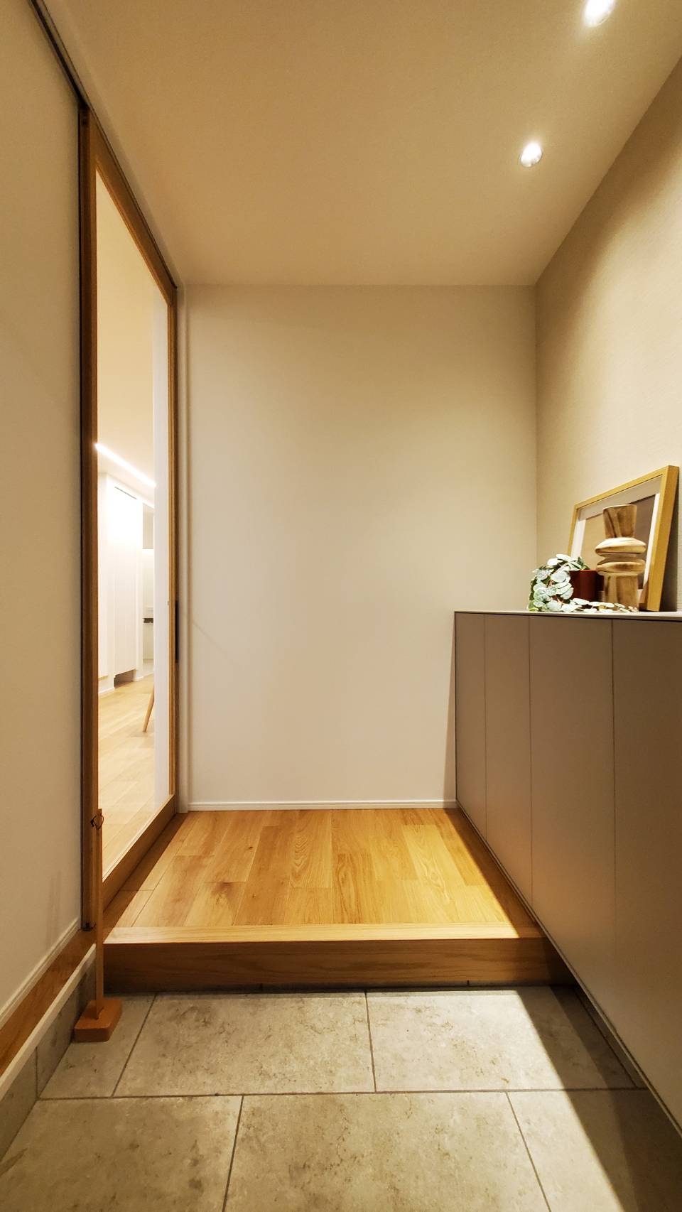 玄関をくぐると、木のぬくもりを感じるフローリングと落ち着いた照明が家族を優しく迎えます。