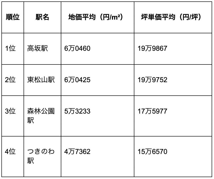 東松山市および周辺の主要駅を対象に、地価平均・坪単価平均順にまとめたものが下表です。