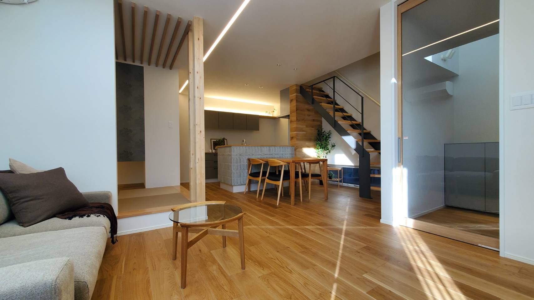 また、室内には和のテイストを取り入れた畳スペースを設けており、家族がほっと一息つける場所になっています。