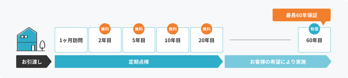 保証会社によるサポートにより、構造・雨漏りなどに対する初期保証は20年・延長保証最長60年の長期保証に対応。