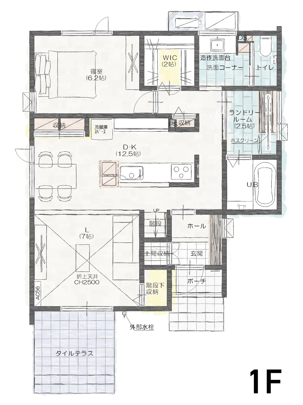 快適な1F寝室と2.5mの折上天井リビング・木目柄のキッチンが魅力的な建売住宅です。