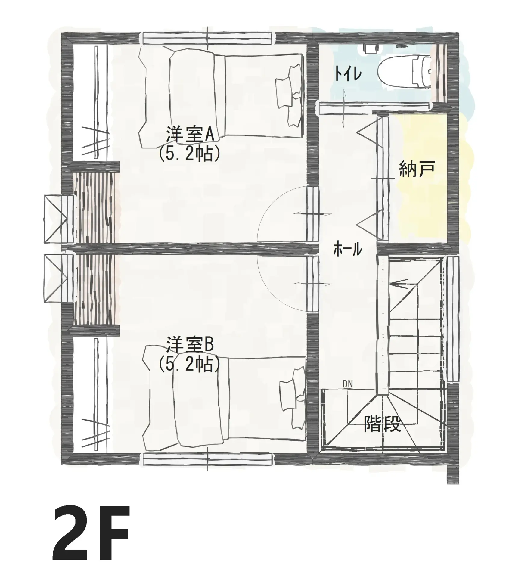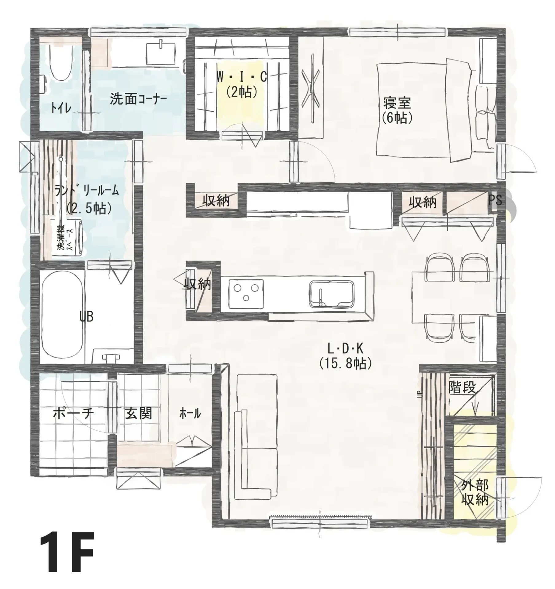 1階に設置した寝室、回遊性のあるキッチン、ゆとりサイズの洗面台、外部収納、寝室と独立させたWICなど無駄のない空間設計。