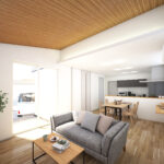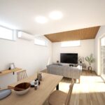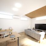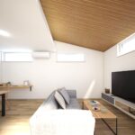 ・木目柄の勾配天井を活かした、開放感あふれるリビング空間。
