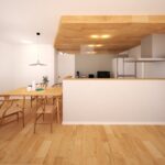 ・木目調の折り下げ天井がキッチンのアクセントに。