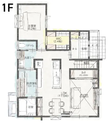 🔍『おやすみラク動線』の1階寝室に、玄関からキッチン、洗面スペースへ直接行きやすい『おかえり動線』