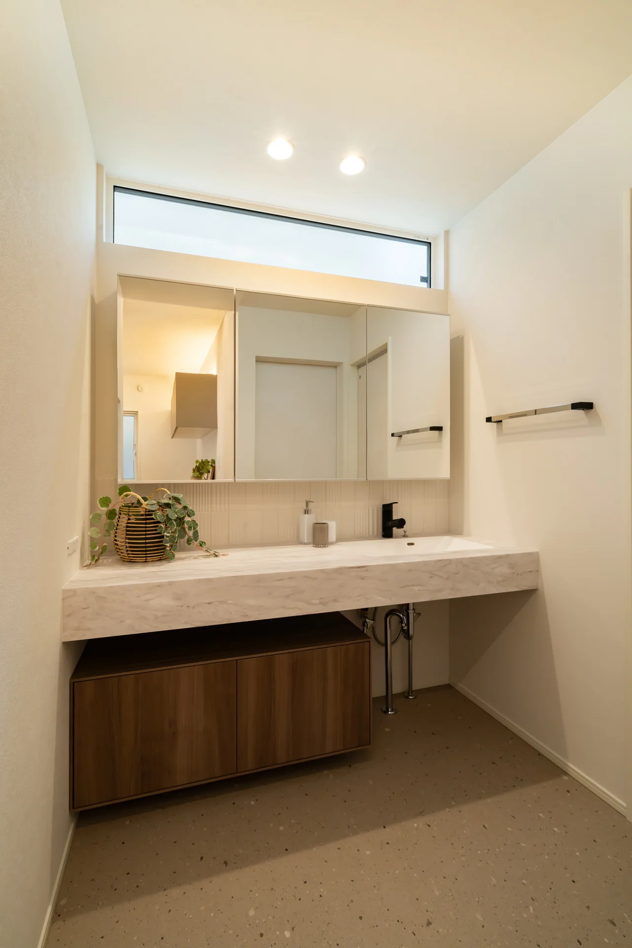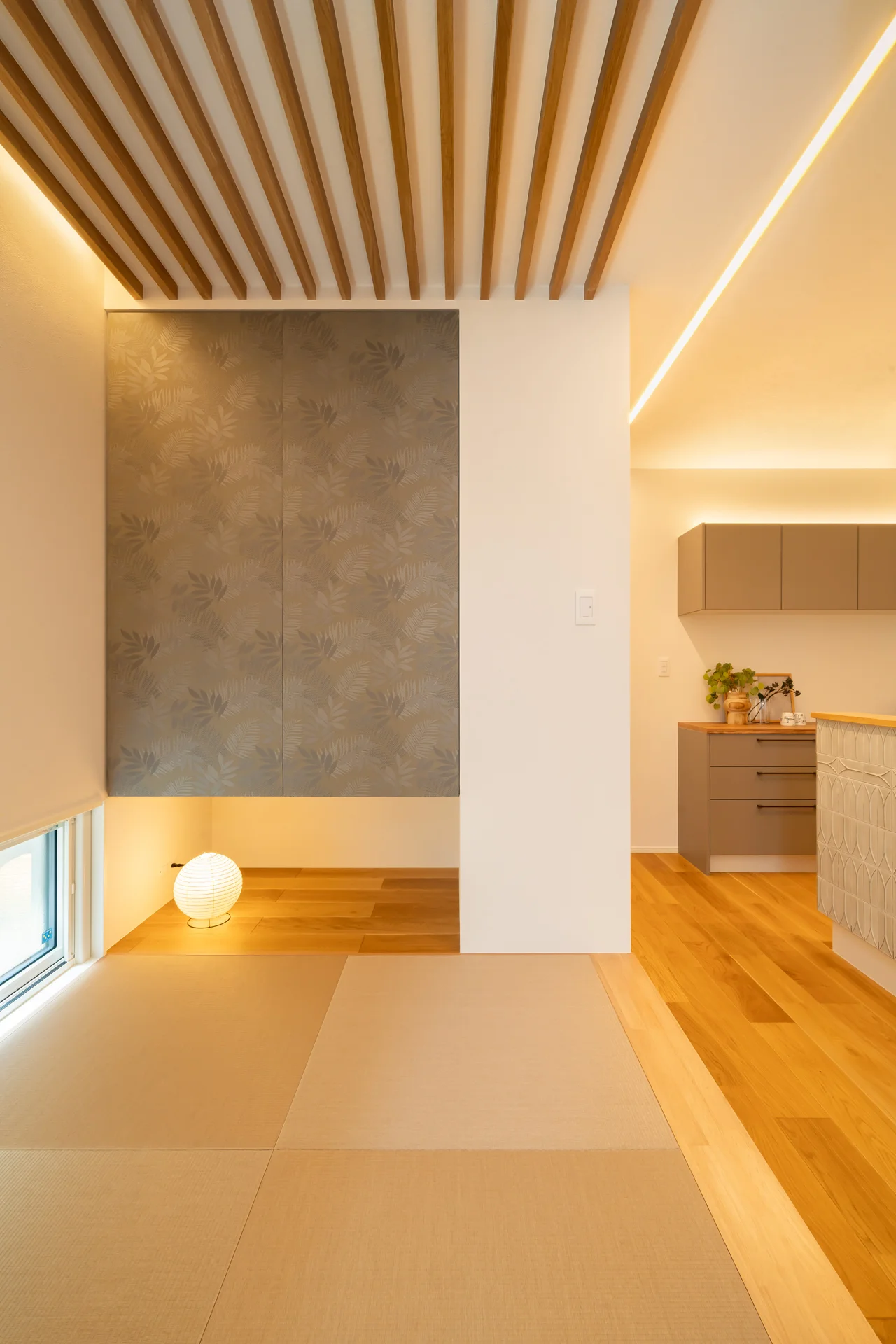また、間接照明を取り入れ、部屋の端から空間全体を明るく照らすライティングプランにより、広々と感じられる空間が広がります。