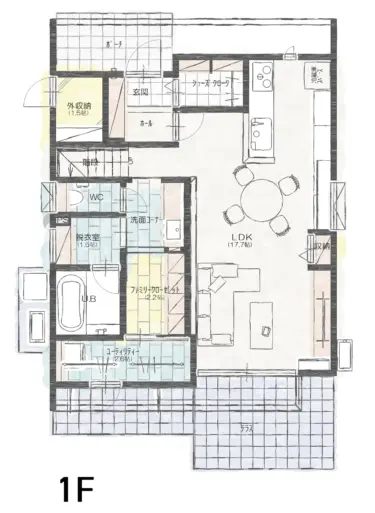 LDK約18帖の広々とした空間と、タイルテラスがひとつながりになった開放的なリビング。