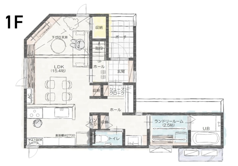 室内には、2.7mの食器棚やパントリー・シューズクローク・4帖のファミリークローゼットなど、随所に大容量の収納スペースを完備。
