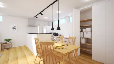 18帖以上の広々LDKは、大きな窓から光と風を取り込み、家族が自然と集まる開放的な空間に。