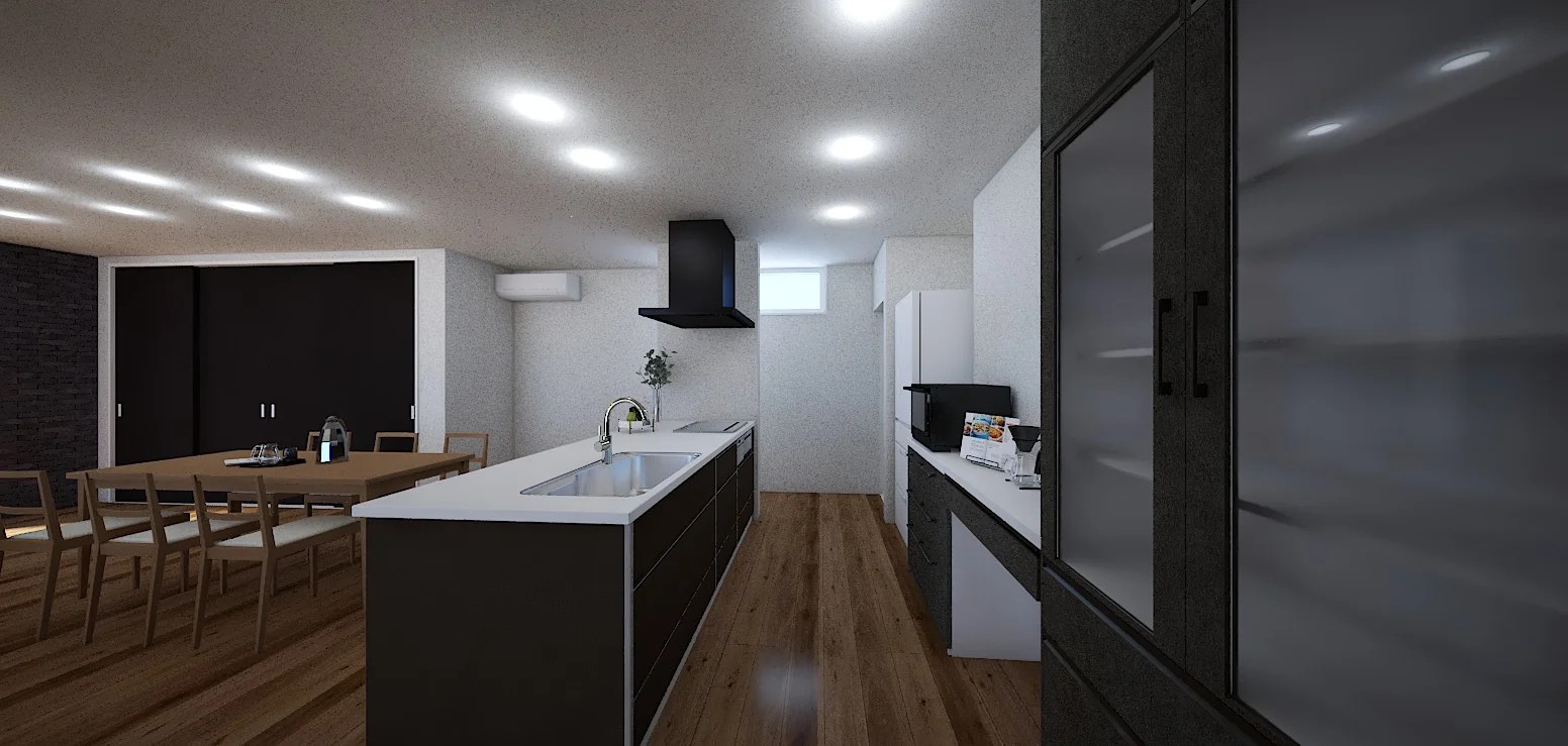 ✅リビングになじむオシャレなアイランド型キッチン+W=2700のカップボード